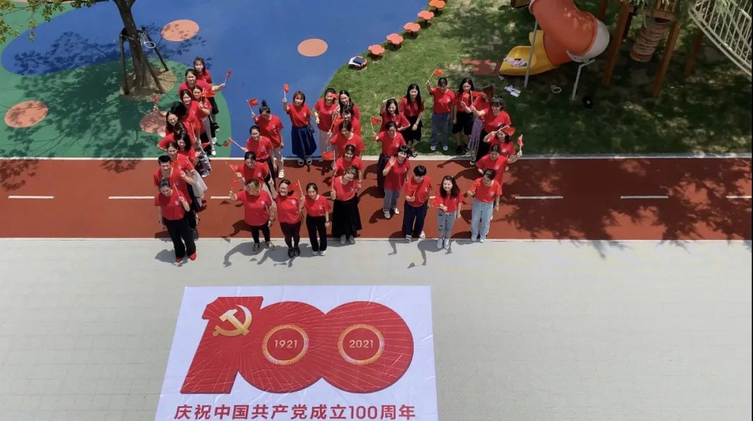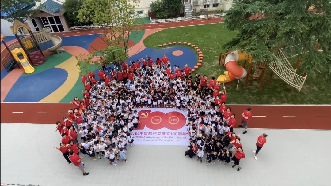 闵行万科幼儿园全体师生与幼儿汇聚在操场,共同祝福建党100周年。